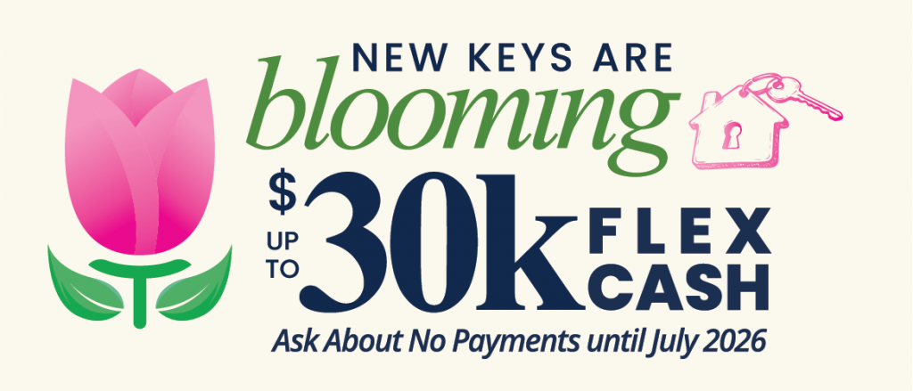 Select quick move-in homes get up to $30,000 in Flex Cash on 1- and 3-bedroom plans or up to $22,500 on 2-bedroom plans. All specs include a $3,000 broker bonus if signed by 3/31. Ask about no payments until July 2026.